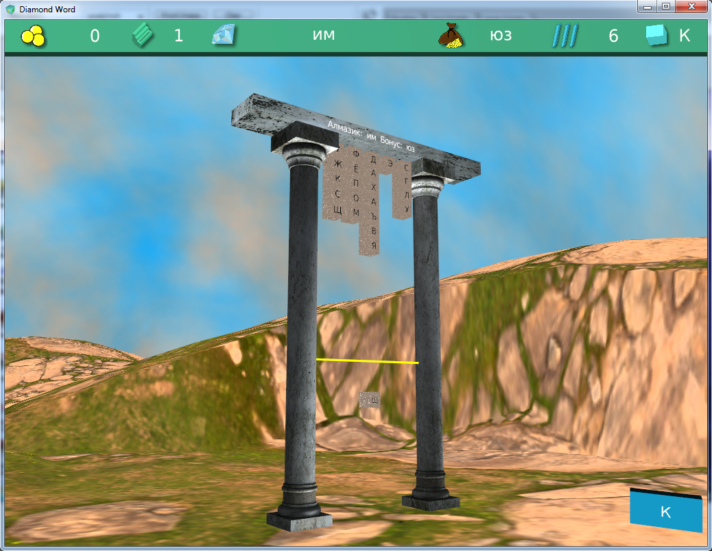 Diamond Word - это словесный экшн, который заставит ваш мозг выложиться на полную в поиске нужного слова или любого слова, только для того, чтобы очистить игровое поле и не сдаться за считаные секунды. Ведь вам предстоит управлять летящими вверх буквами, расставляя их в нужные позиции, чтобы составлять слова. И если вы собираетесь пройти игру, то вам необходимо составлять опреденные слова, которые зовутся здесь "diamond word". Игра начинается с короткого слова, всего из двух букв, а заканчивается на слове из четырнадцати букв. И так правила игры просты: вы составляете нужные слова и поле очищается, продвигая вас на новый уровень с удлинённым Diamond словом. Игра предоставляет игроку выбор скорости летящих вверх букв, а также выбор ширины поля, что влияет на сложность игры. Сложности также добавляет тот факт, что буквы выпадают случайным образом, и бывает так, что нужная сейчас буква никак неторопится выпадать, а точнее вылетать. И вам нужно как-то выкручиваться из этой ситуации, составляя любые слова, чтобы в последствии стереть их, очистив поле. Потому как, если буква пристыкуется к пятнадцатому ряду, вы проиграете. Конечно, вам не придётся начинать всё с самого начала. Если вы смогли подняться на уровень выше, то с него и начнёте. И хоть игра имеет в себе приличный по объему словарь, вы можете обнаружить, что не все слова подсвечиваются, а это означает, что конкретно этого слова нет в словаре. Diamond Word поддерживает три языка, это английский, русский и немецкий. Меняя словарь в меню игры, меняется и язык интерфейса. Я постарался сделать игру максимально простой и понятной, чтобы она была доступна и интересна различной возрастной категории. А ещё в игре реализована камера, что даёт вам возможность выставить нужный вам ракурс, приближаться или отдаляться.
